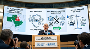 The UN High Commissioner for Human Rights warns of widespread impact on civilians and civilian infrastructure in the escalating Middle East conflict, urging all parties to exercise restraint.